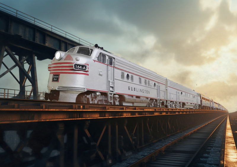 Lok des Typs FP7 der Chicago, Burlington & Quincy Railroad (Modell aus Tillig-Kleinserie) in einer virtuellen Umgebung, die mit der KI-Engine Midjourney erstellt wurde. |