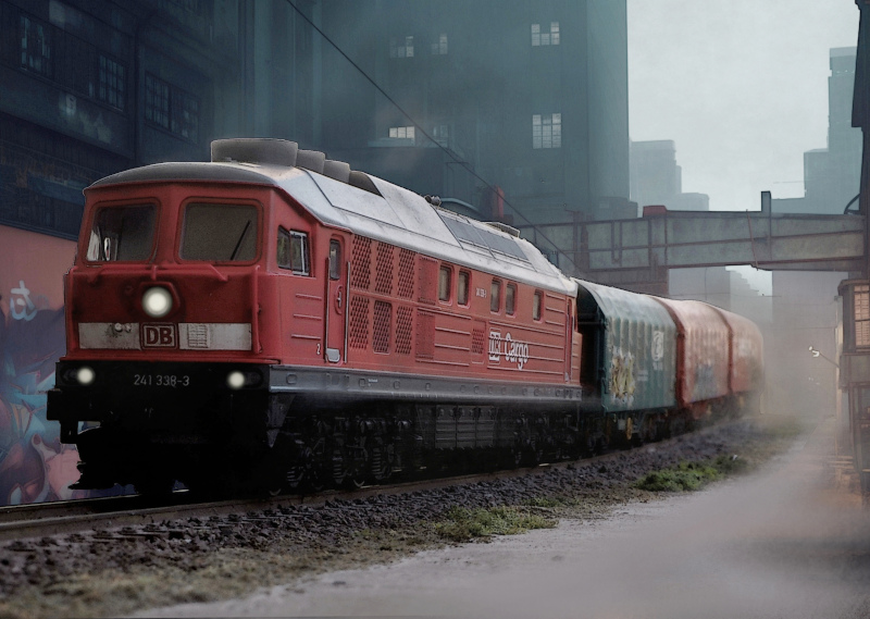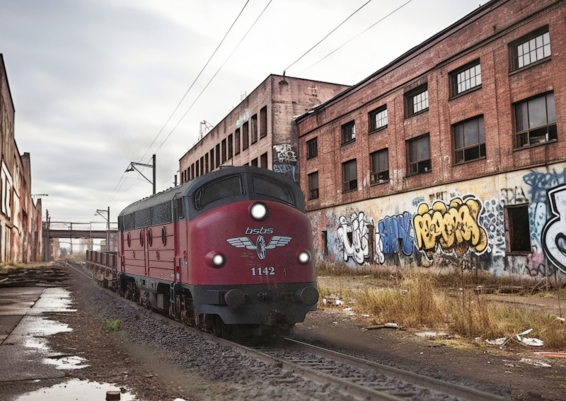 Lok des NOHAB-Typs AA16 des Braunschweiger Eisenbahnverkehrsunternehmens BSBS, beschriftet als My 1142 in der Farbgebung des früheren Eigentümers DSB (Modell von Tillig) in einer durch Industriegebiete am Rande Berlins inspirierten virtuellen Umgebung, die mit der KI-Engine Midjourney erstellt wurde. |