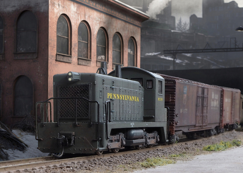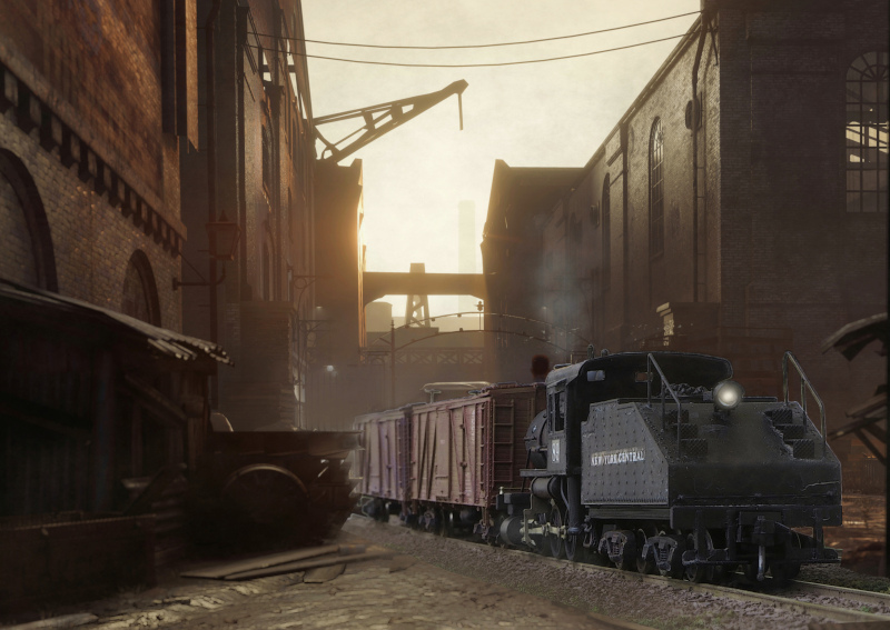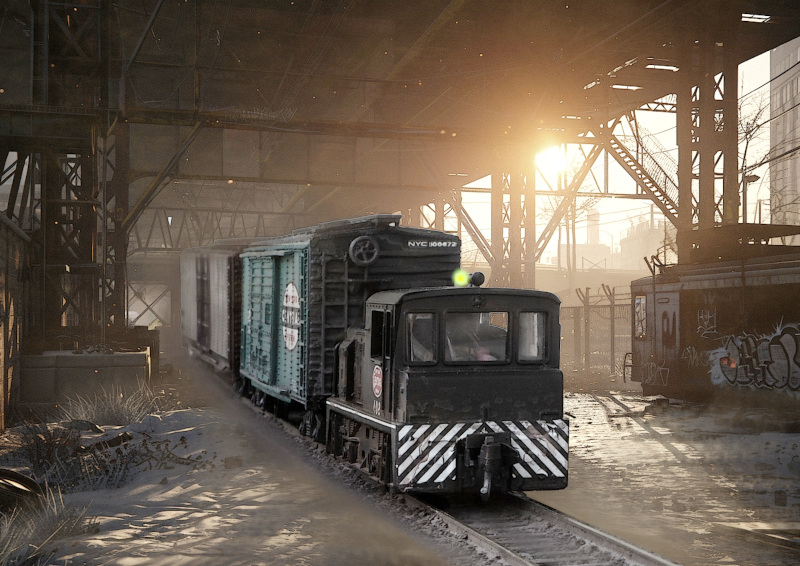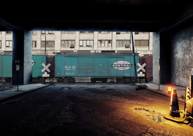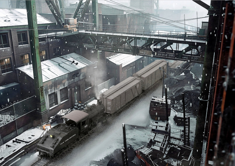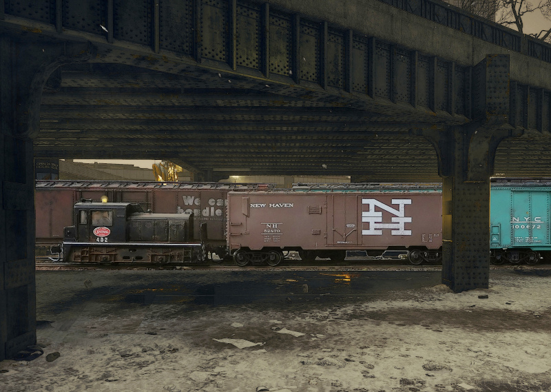 Die Rangierlok der New York Central Railroad ist von Lok-N-Roll aus Leipzig. Die Wagen stammen von Lok-N-Roll und vom Modellbahnhof Geringswalde. Für die virtuelle Umgebung wurde ein Screenshot des Gamers Anthemios aus dem Computerspiel "The Division" verwendet. |