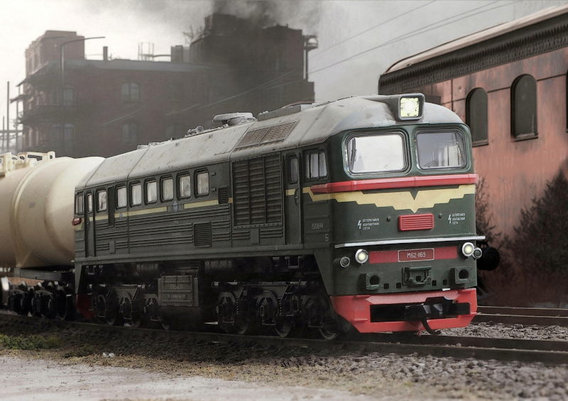 Die Lok ist eine M62 (entspricht der DR-Baureihe 120) von Roco. Der hinter der Lok zu sehende Wagen ist ein achtachsiger Großraumkesselwagen vom russischen Hersteller Peresvet. Für die virtuelle Umgebung wurde ein Screenshot der Gamerin Larah Johnson aus dem Computerspiel "Metro Exodus" verwendet. |
