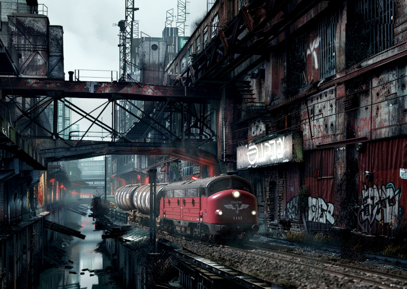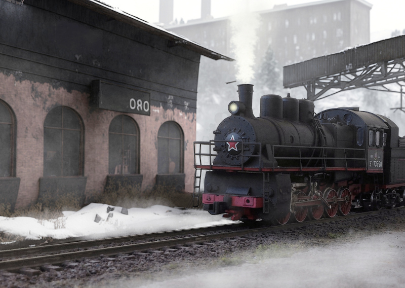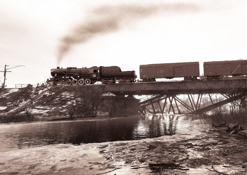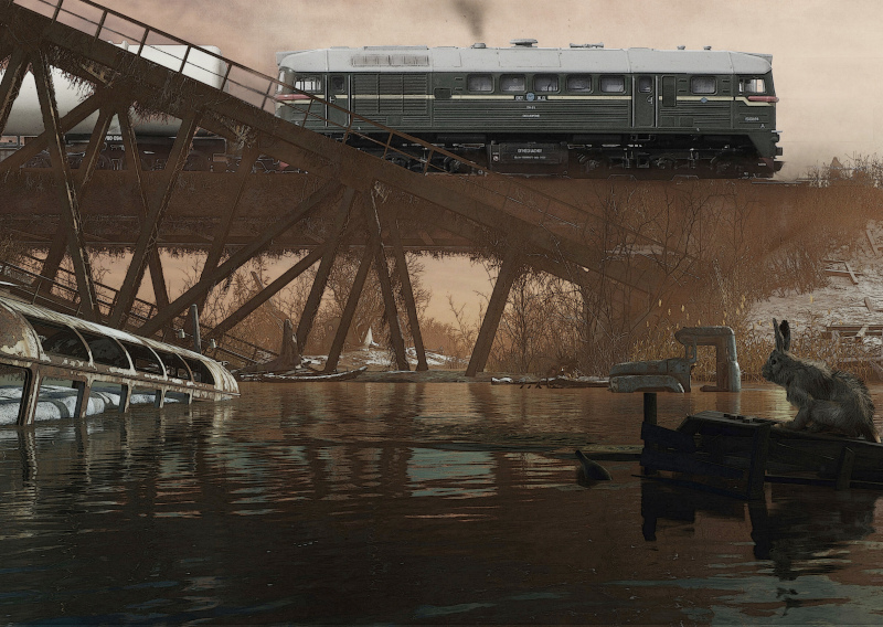 Die Lok der Baureihe TE (sowjetische Bezeichnung der erbeuteten deutschen Baureihe 52) ist von der Modellbahnmanufaktur Sebnitz. Die Wagen stammen vom russischen Hersteller Peresvet. Für die virtuelle Umgebung wurde ein Screenshot des Gamers X-Nergal-X aus dem Computerspiel "Metro Exodus" verwendet. Die Szenerie wurde fast an der gleichen Stelle aufgenommen wie in dem Bild "The bridge", nur von der anderen Seite gesehen. |