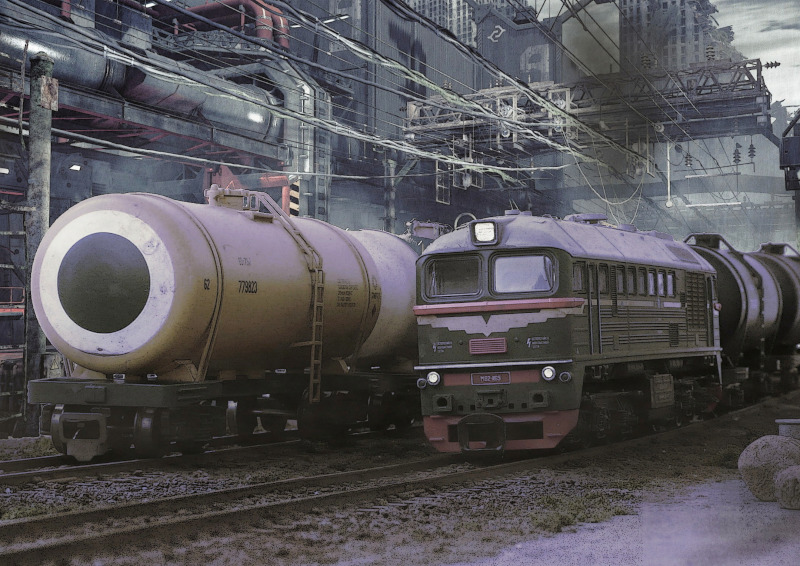 Die Lok der Baureihe M62 ist von Roco, die Kesselwagen sind vom russischen Hersteller Peresvet. Für die virtuelle Umgebung wurde ein sog. „Mod“ des Gamers Anthemios auf Basis eines Screenshots aus dem Computerspiel „Crisis III“ verwendet. |