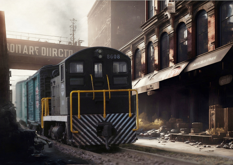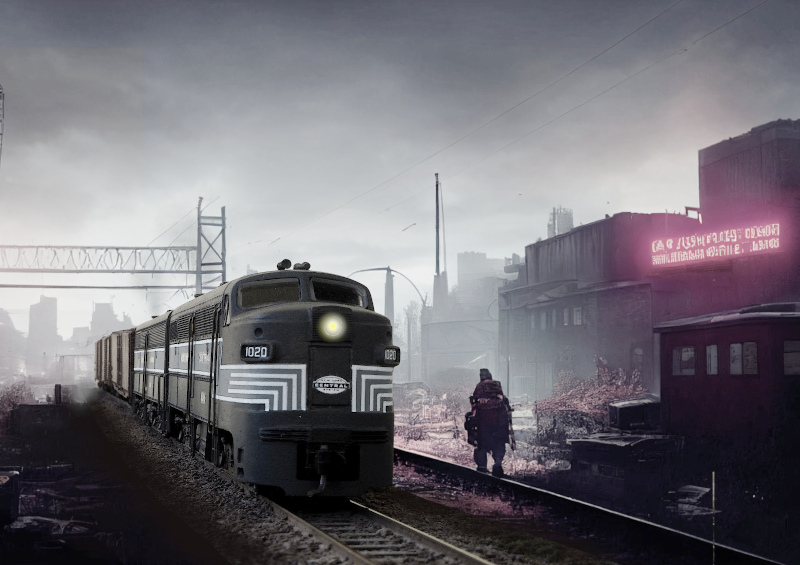 Die Lok des Typs Alco FA/FB der New York Central Railroad ist von a & k tt-modell. Die virtuelle Umgebung wurde mit der KI-Engine Midjourney in Anlehnung an die Ästhetik des Computerspiels "Homefront: The Revolution" erstellt. |