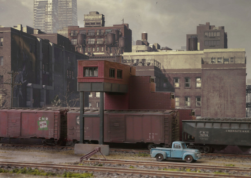 Das Stellwerksmodell ist ein Umbau aus Auhagen-Teilen, die Wagen sind vom früheren US-Hersteller Gold Coast (gehört heute zu Lok-N-Roll in Leipzig). Die virtuelle Umgebung entstand aus einem Screenshot des Gamers Anthemios aus der Beta-Version des Computerspiels "The Division". |