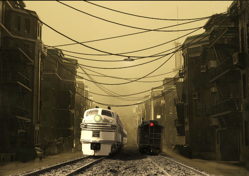 Das Dampflokmodell nach einem Vorbild der New York Central Railroad ist von a & k tt-modell, die Wagen sind von Gold Coast. Die virtuelle Umgebung entstand aus einem Screen¬shot der Gamerin Larah Johnson aus dem Computerspiel „Vampyr“. |