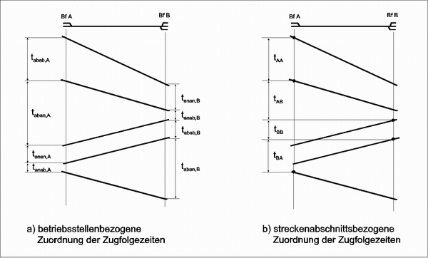 Bei Leistungsuntersuchungen hat es sich allerdings als vorteilhaft herausgestellt, sich von der betriebsstellenbezogenen Zuscheidung der Zugfolgezeiten zu lösen und die Zugfolgezeit als Differenz zwischen den Einfahrzeitpunkten zweier Züge in den Streckenabschnitt anzugeben, egal aus welcher Richtung die Einfahrt erfolgt. Man erhält dann für alle Zugfolgefälle nur noch eine einzige, auf diesen Streckenabschnitt bezogene Mindeszugfolgezeit. Damit ergibt sich auch für jeden Streckenabschnitt nur eine Matrix der Mindestzugfolgezeiten. Das folgende Bild stellt beide Formen der Zuscheidung von Zugfolgezeiten gegenüber.